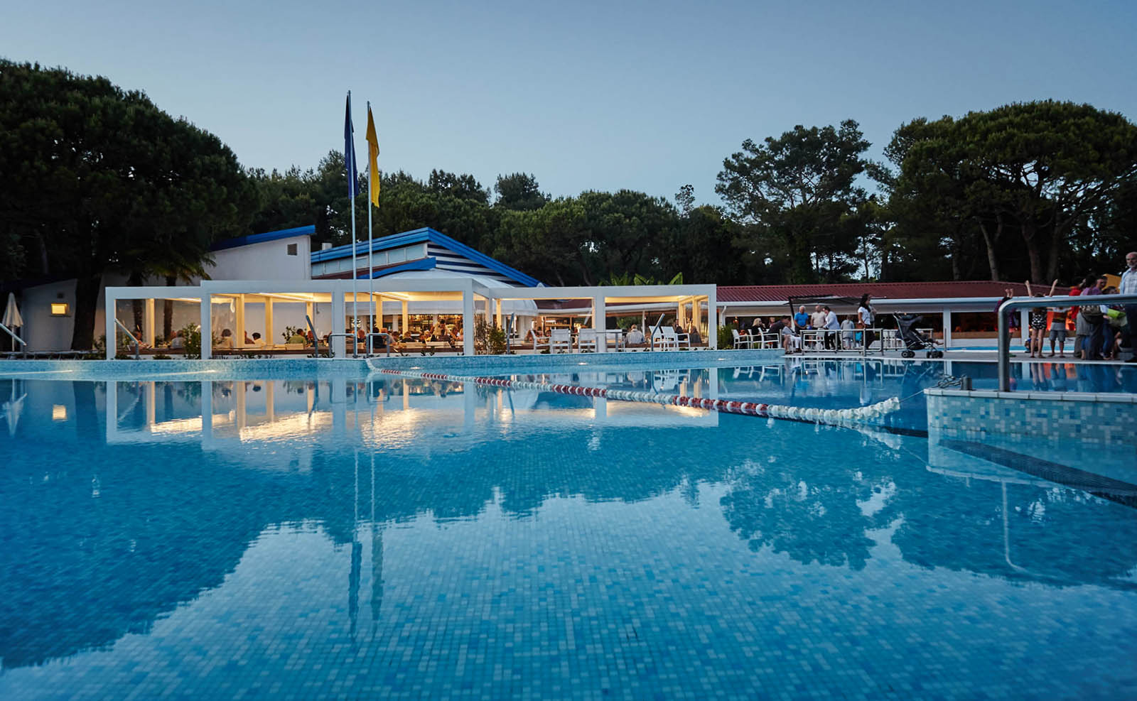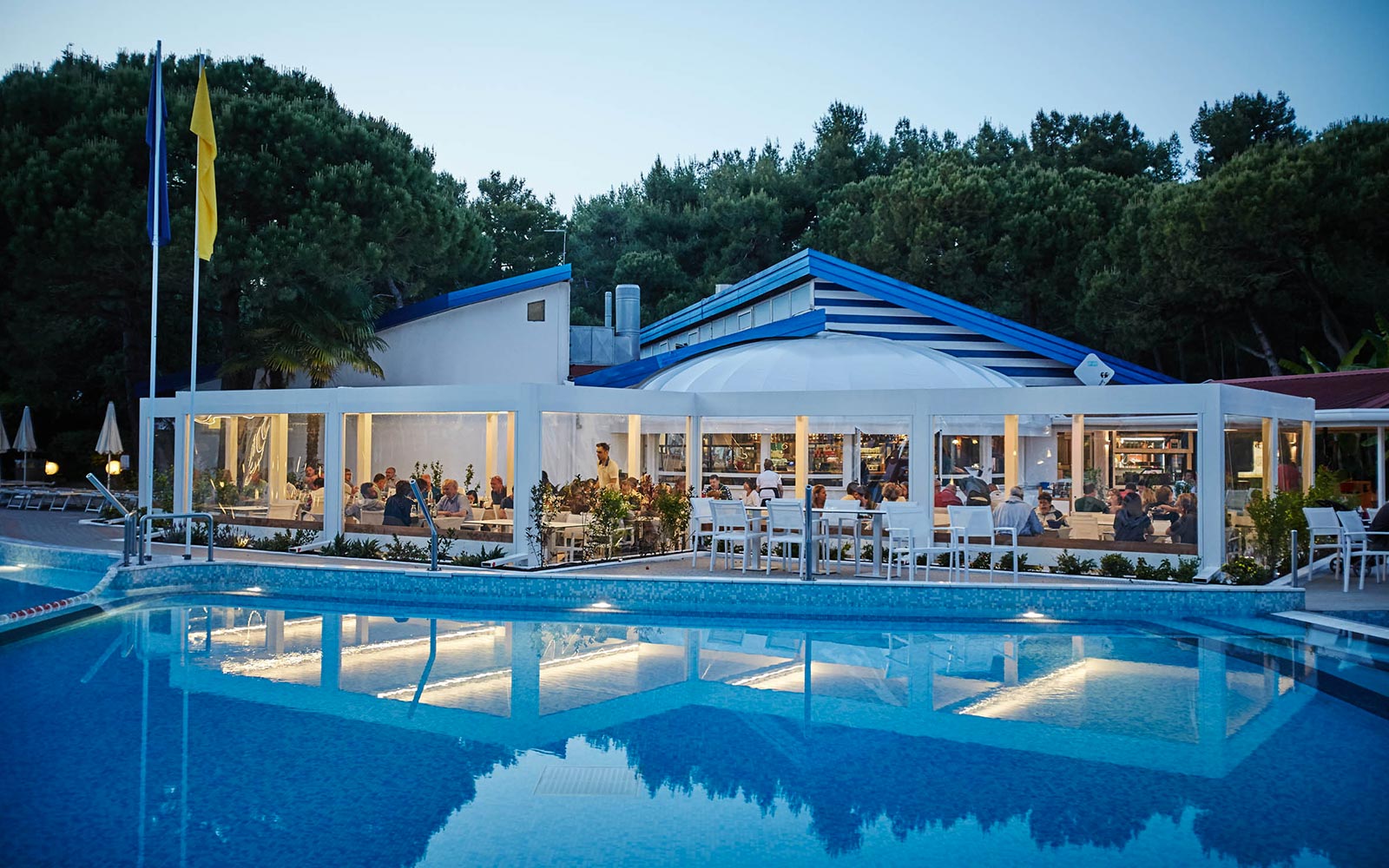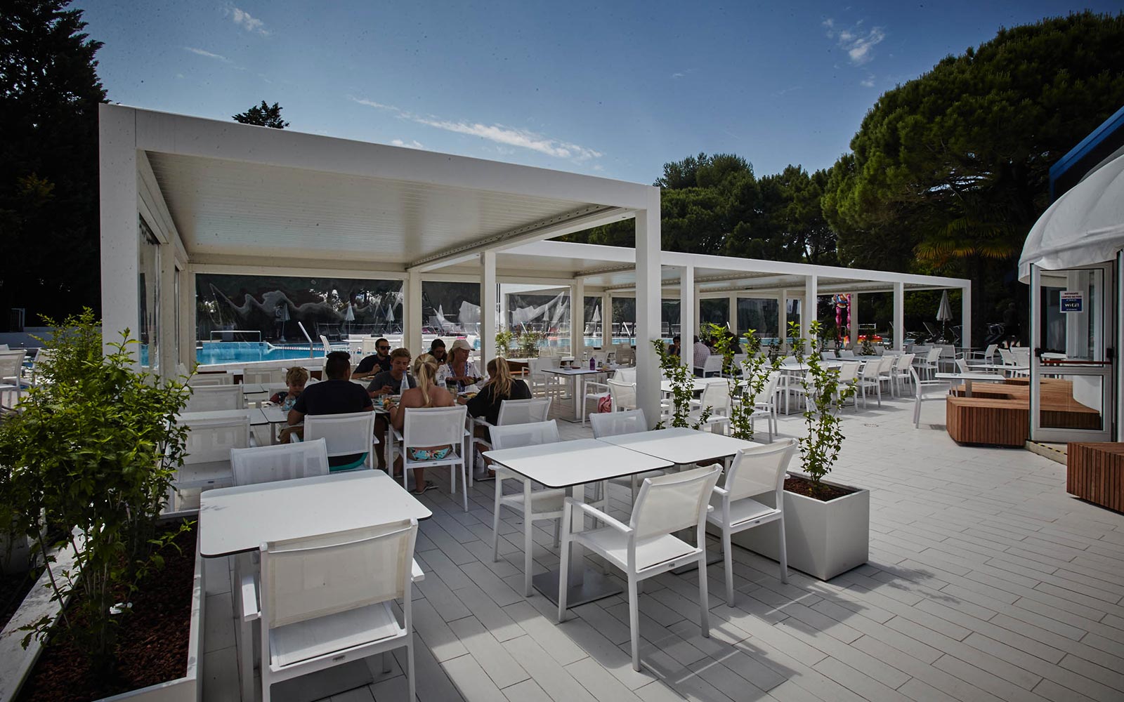 L’area ristorante, situata nel cuore del Camping Village Dei Fiori, vicino a Venezia, comprende due ampie terrazze aperte sulle piscine e disposte intorno a un American Bar, un’ampia sala interna dominata dal grande forno a legna per le pizze e un’area self-service per pranzare in libertà.