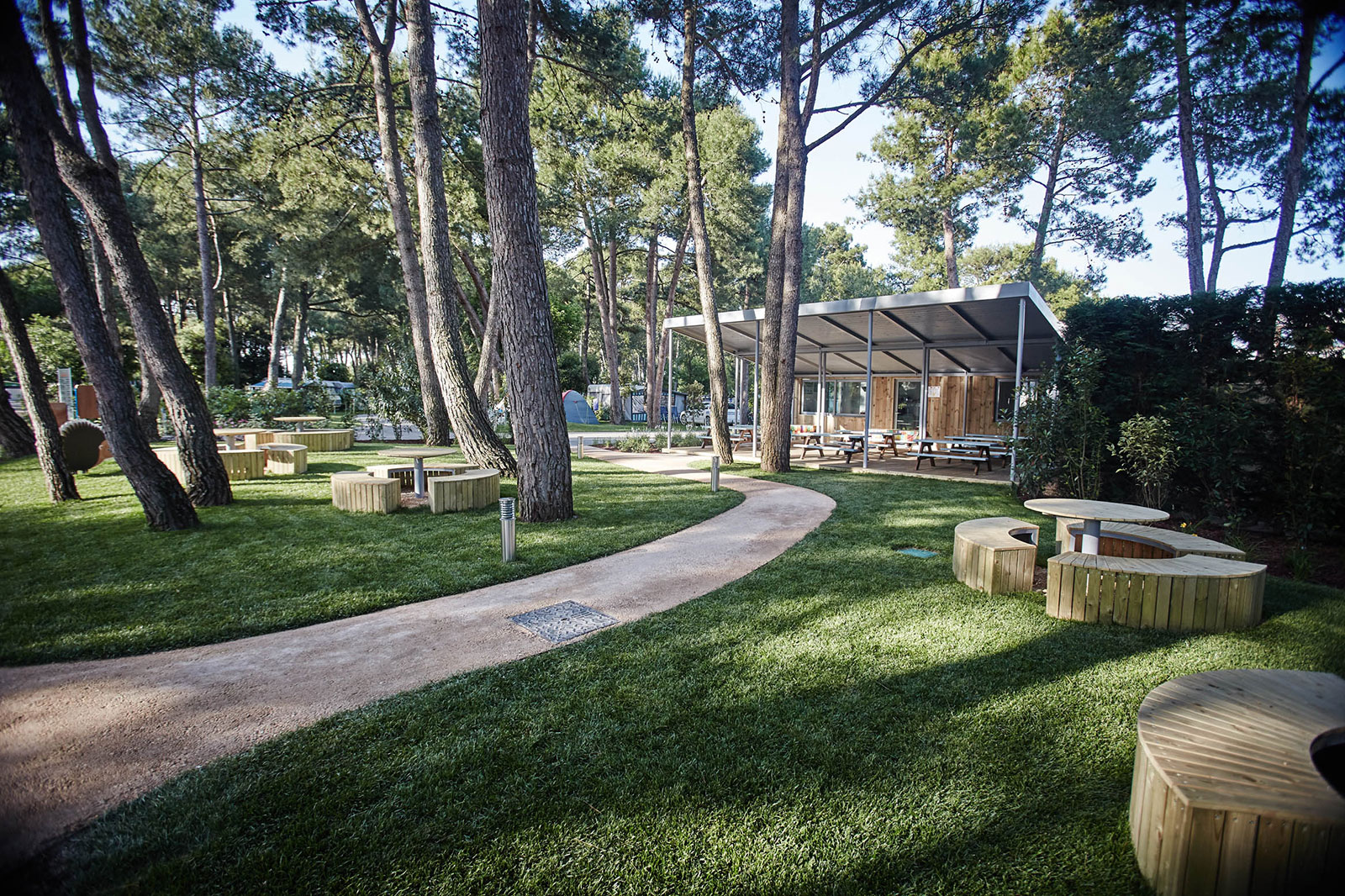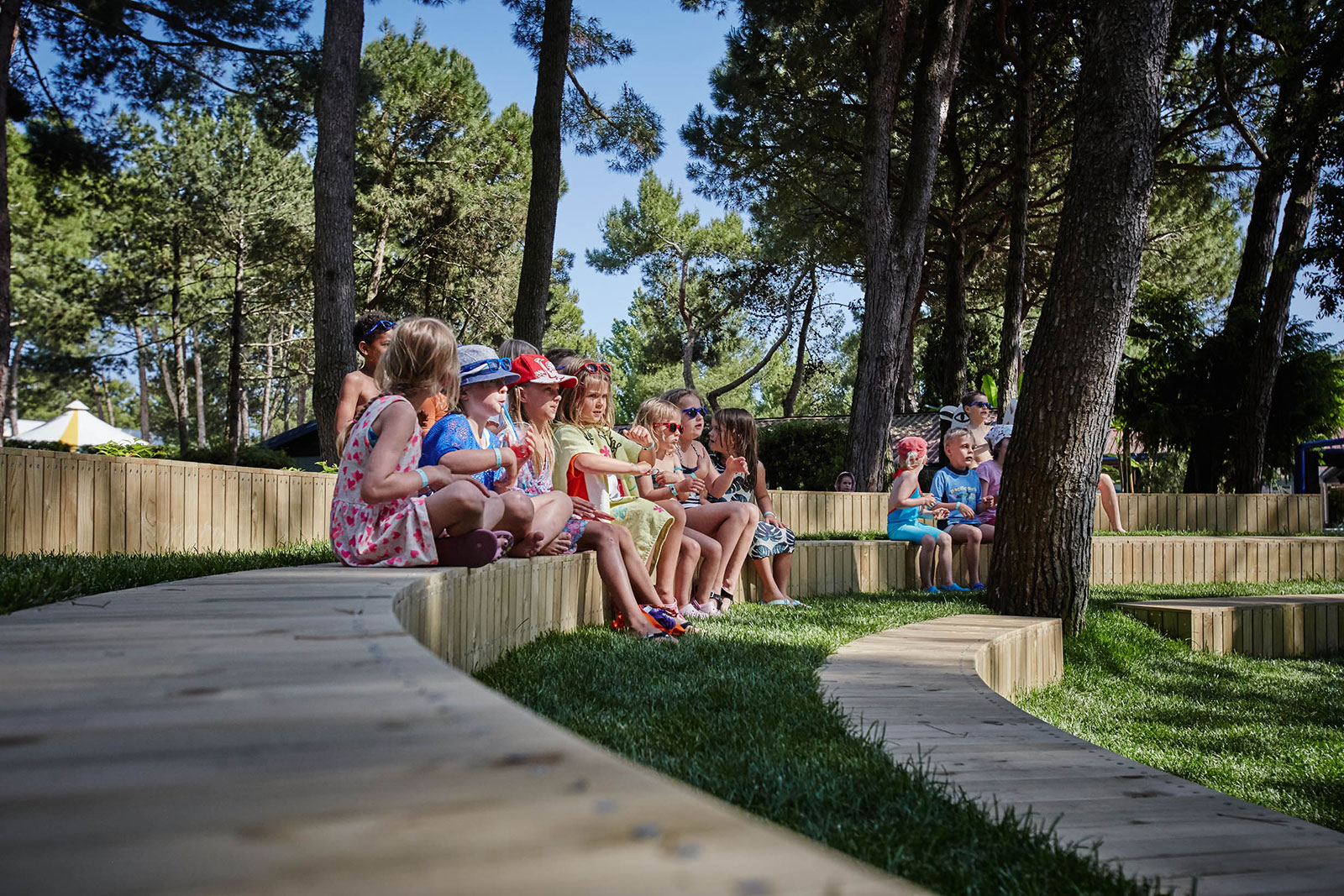 Eine kleine Arena im Grünen, ein Häuschen zwischen Pinien, ein weicher Rasen… Blumenbeete, kleine Tische und Sitzbänke… drei sympathische Maskottchen, die ein kleines Kinderparadies bewachen.