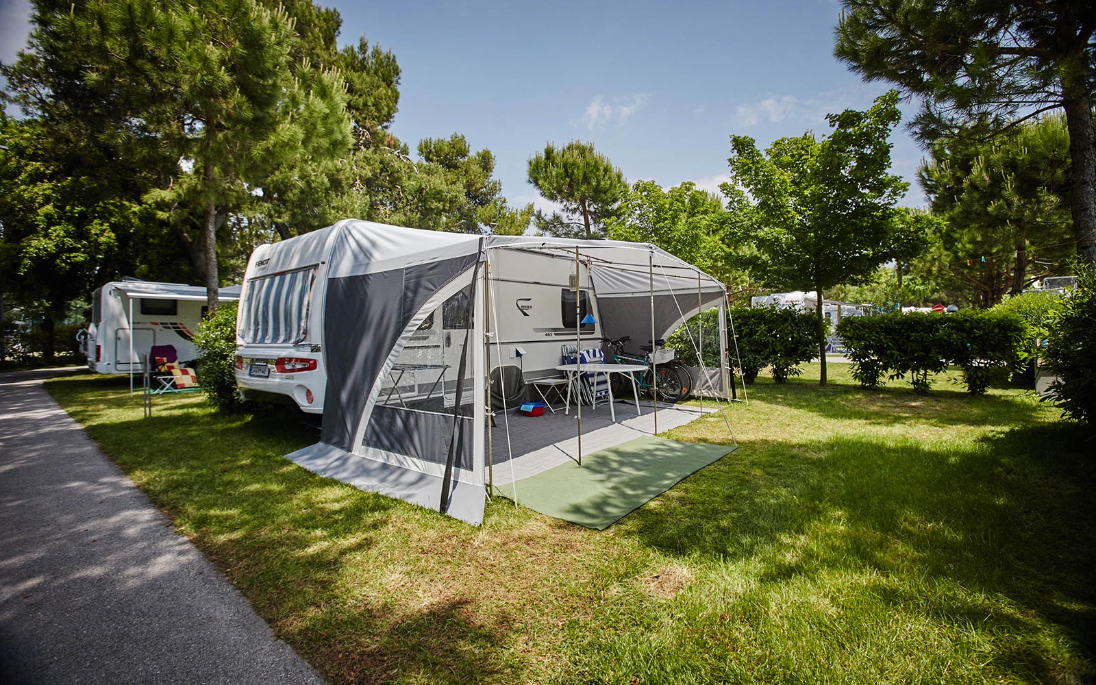 Stellplätze unter Bäumen im Pinienwald